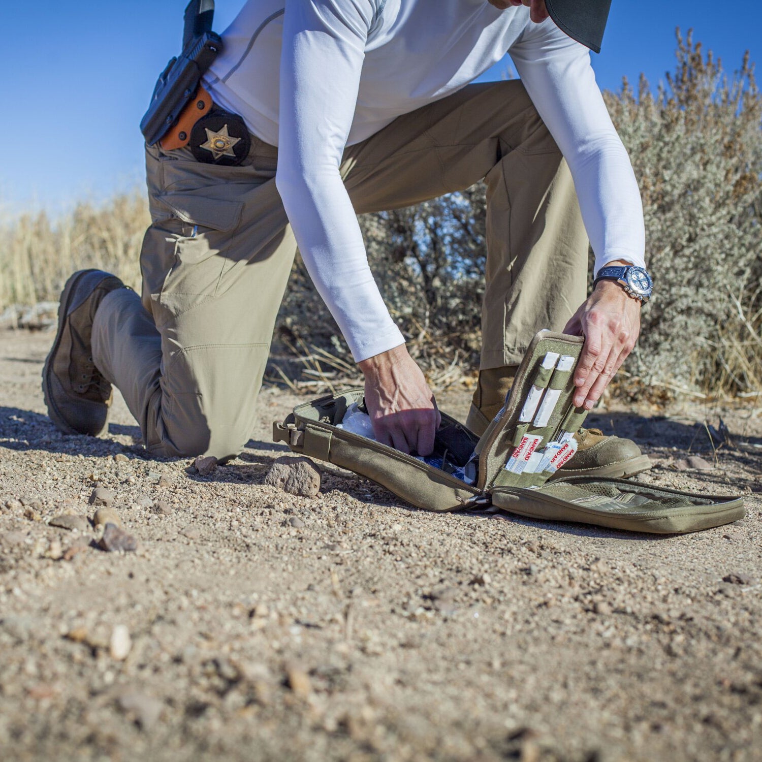 - Easy Attachment: The rear wall is fitted with (coverable) Velcro patches to attach the med kit to car upholstery or bag Velcro panels (e.g., Rangemaster Bag®).