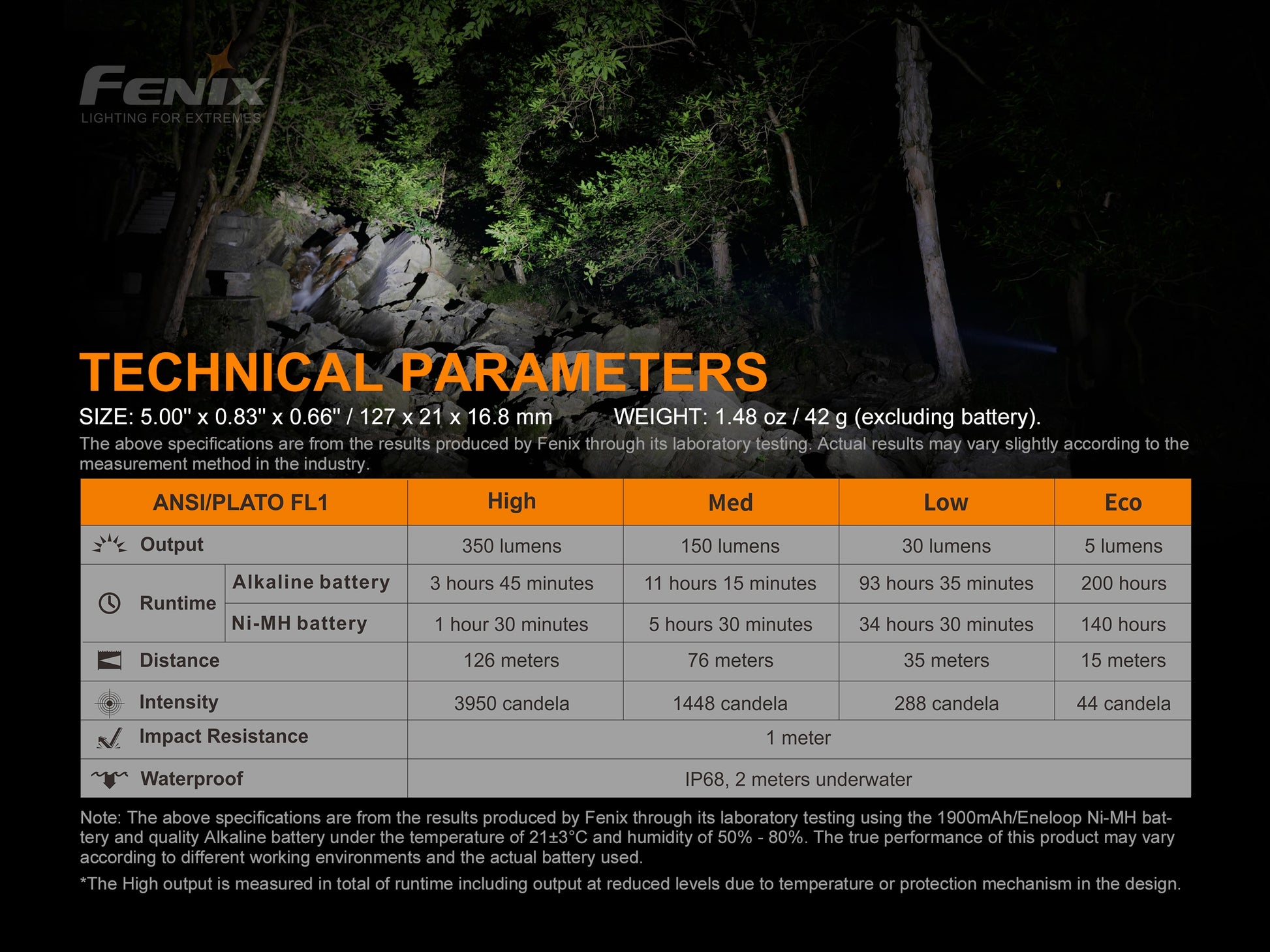 Fenix E20 V2.0是便攜式EDC手電筒。通過單尾巴開關實現單手輸出選擇。裝有單個Luminus SST20 LED,該燈最大輸出350流明,最大光束距離為126米。指示燈帶有兩節AA電池,可以更換電池。其他功能包括4個輸出電平,數字調節電路和IP68額定保護。手電筒在戶外活動和日常生活中用途廣泛。