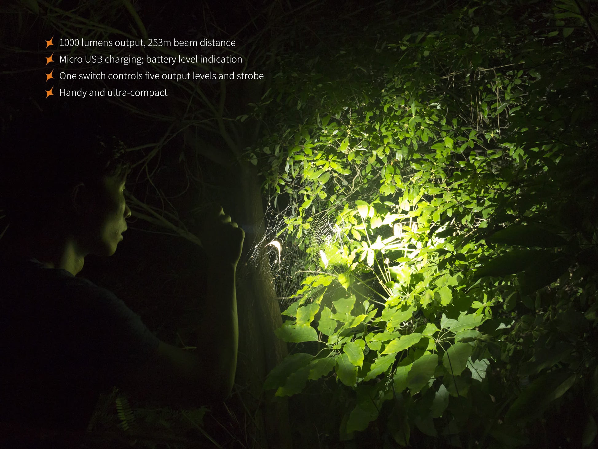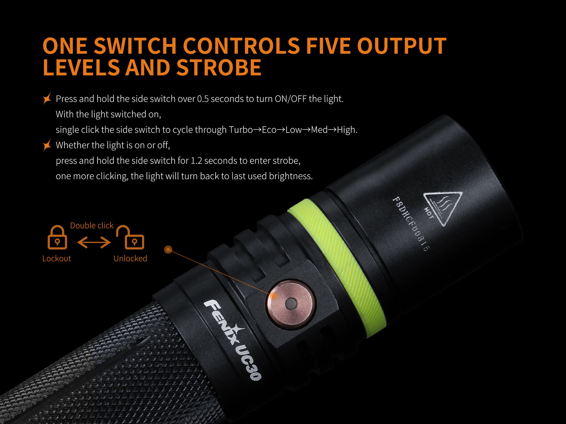 UC30 is a Micro USB rechargeable flashlight that features compact size, high output and exquisite workmanship. It is fitted with Cree XP-L HI LED, delivering a max output of 1000 lumens and beam distance of 253 meters. The light is powered by one 18650 rechargeable Li-ion battery, but is also compatible with two CR123A Lithium batteries, five output levels and strobe are controlled by one stainless steel side switch. In addition, battery level indication and IP68 rated protection make UC30 indispensable for family use and outdoor activities.