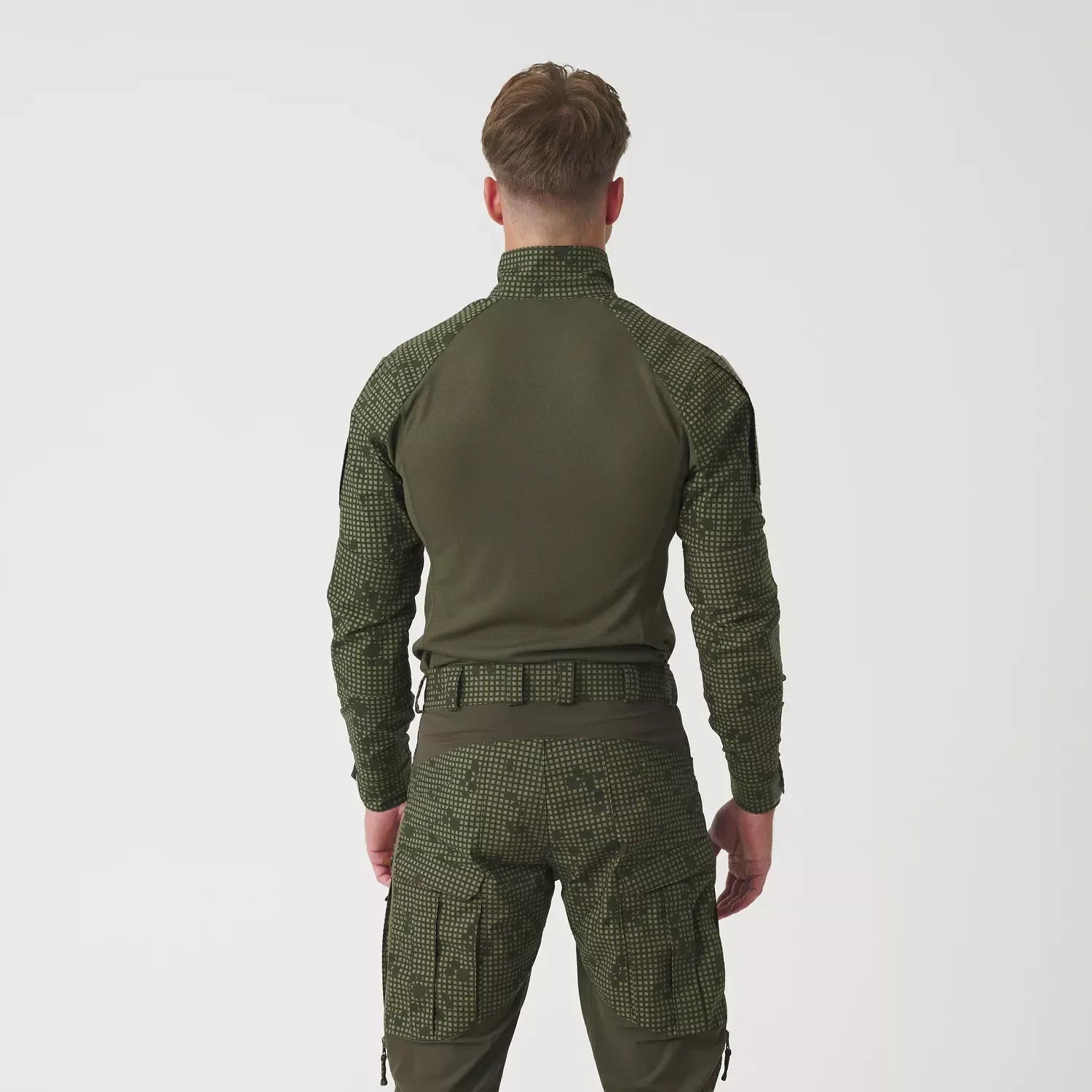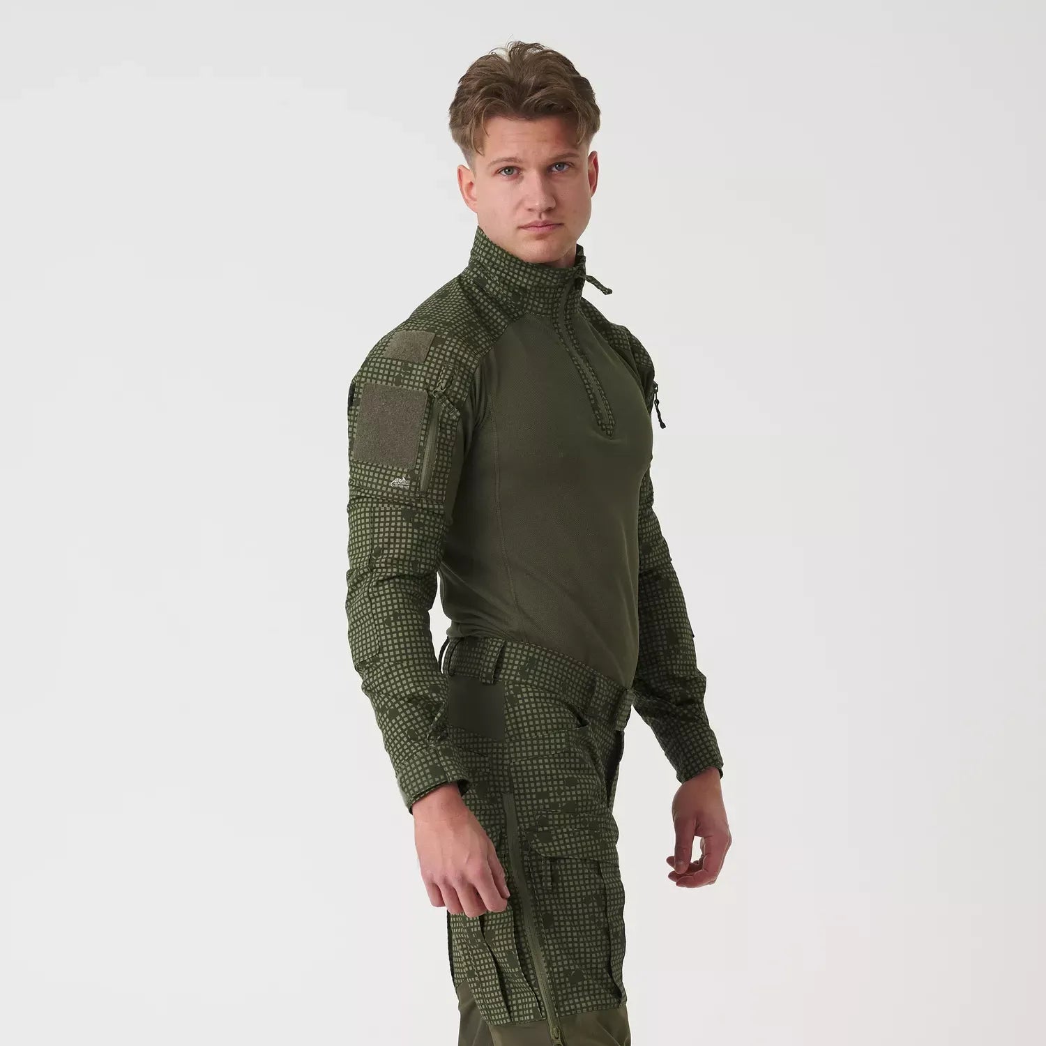 以內穿於護甲背心(plate carrier)/胸掛(chest rig)為設計思路:half-zip 高領降摩擦、速乾中身抑悶熱,肩臂 Ripstop 維持肩帶下的穩定。