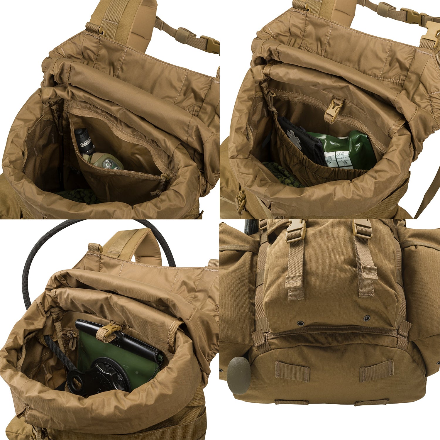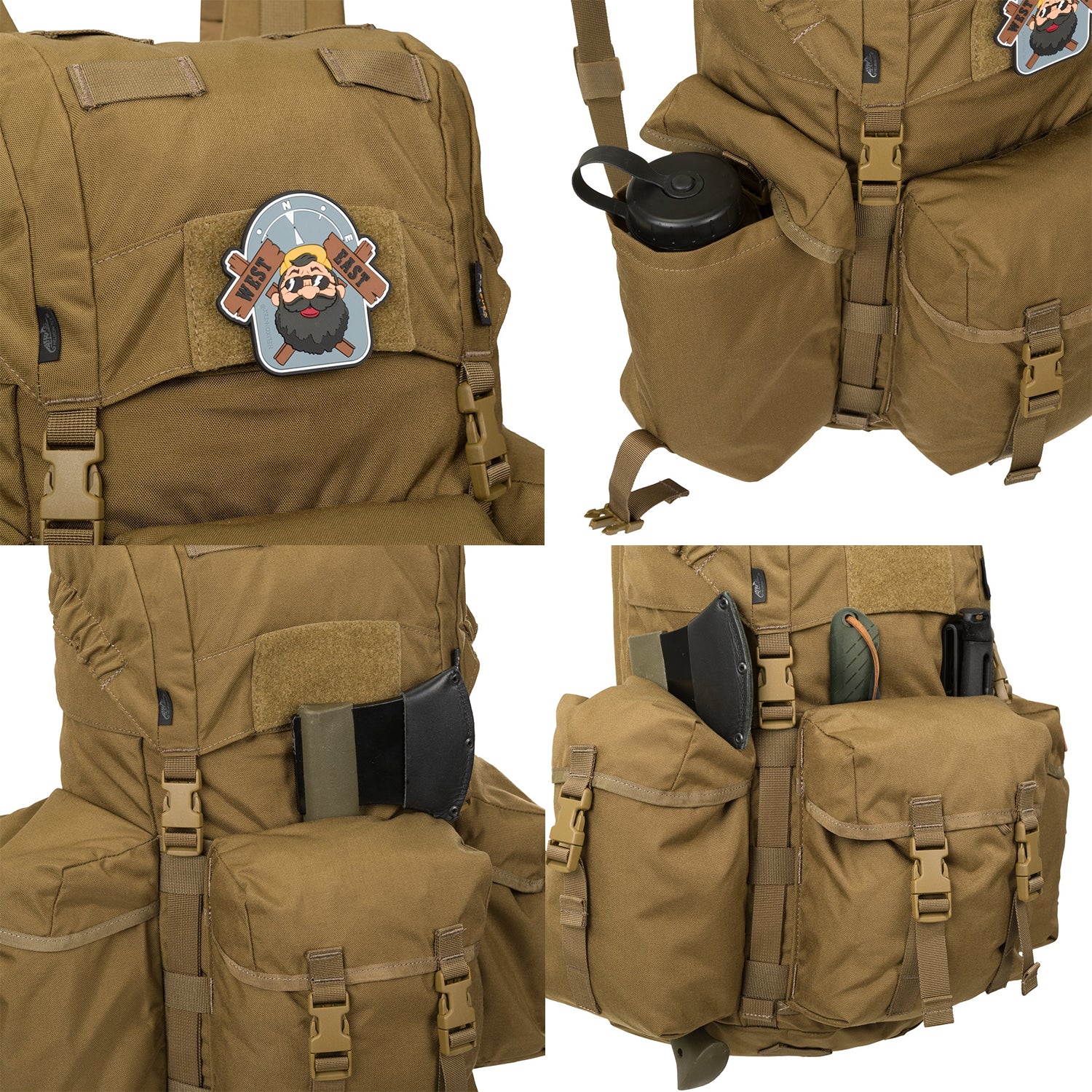 背囊兩側設有兩個通過式與三個非通過式工具插槽,適合攜帶斧頭、摺鋸、攝影腳架或其他長型工具。底部附有固定帶,方便加掛睡袋或外套。