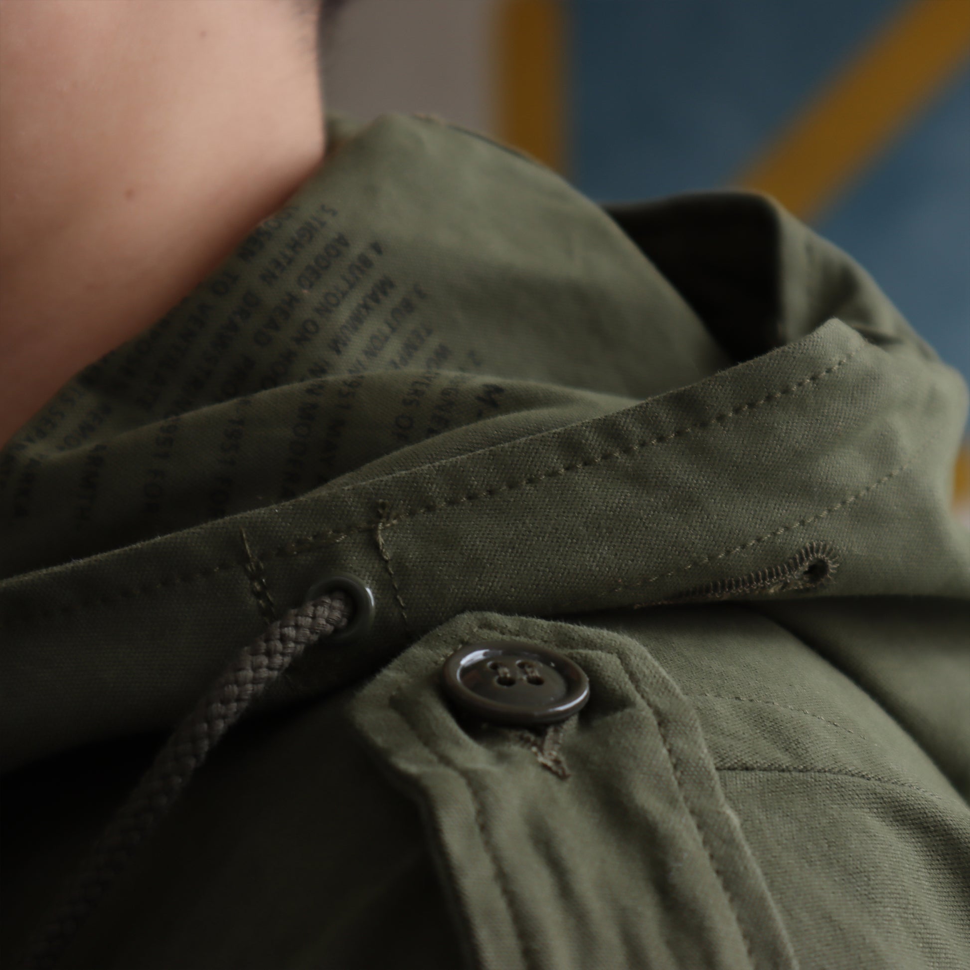 作為軍方供應商,John Ownbey 忠實地再現了原版 M-51 設計,包括肩部的肩章、帶拉鍊和按扣的雙前襟、翻蓋口袋、腰部和下擺的抽繩等。布料上印有搬運注意事項、尺碼、NSN等說明標籤,跟原版實物一樣,而且做工細緻。