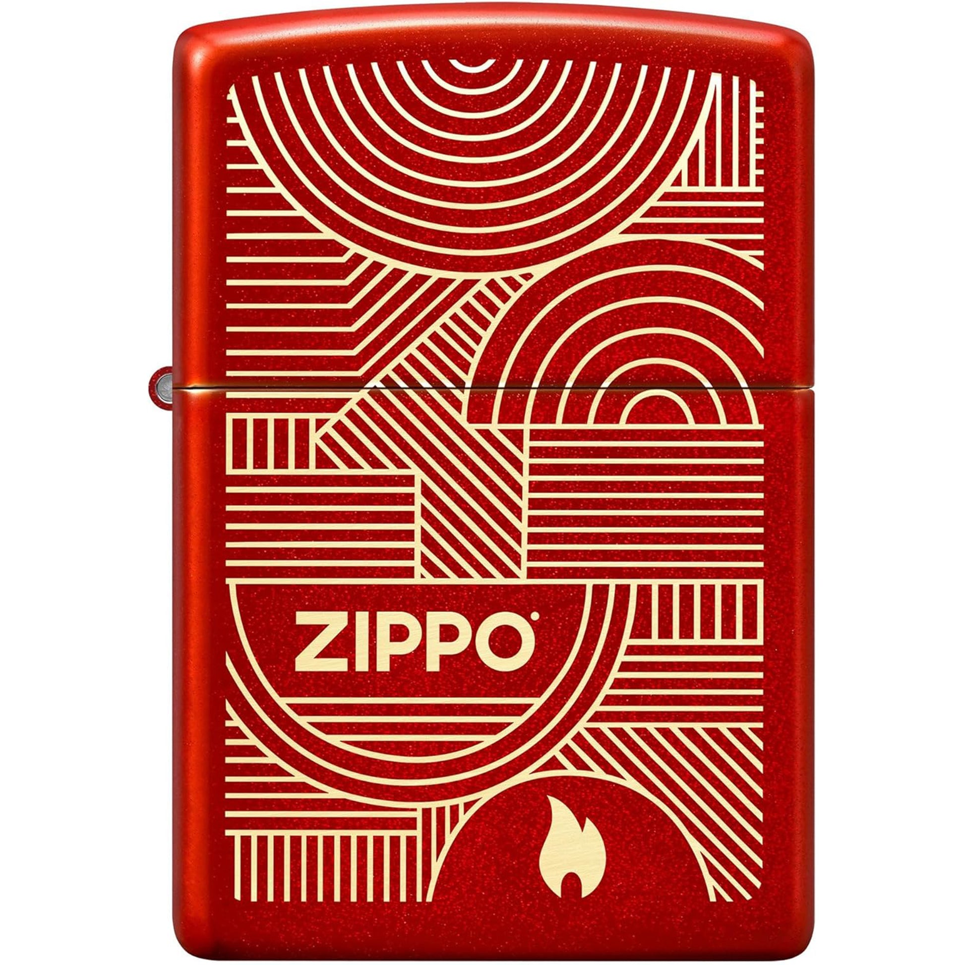 這款 Metallic Red Zippo 打火機以其豪華的雷射雕刻設計引人注目,展現了複雜的弧線和柔和線條在打火機表面的輻射效果。同時融入了經典的Zippo標誌和火焰圖案,增添了獨特的品牌象徵。
